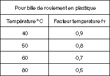 Roulement à billes avec bille de roulement en acier Jusqu'à 100 °C. Pour les températures supérieures à 100 °C, seuls les roulements à billes nus sans joint de feutre devraient être utilisés. Tenir compte de la diminution du coefficient de portée. Utiliser des lubrifiants pour haute température !Tenir compte des indications du fabricant ! Il se peut que l'on doive enlever par lavage l'huile lubrifiante. Roulement à billes avec bille de roulement en plastique Jusqu'à 30 °C Pour les températures de plus de 30 °C tenir compte de la diminution du coefficient de portée. Facteur température